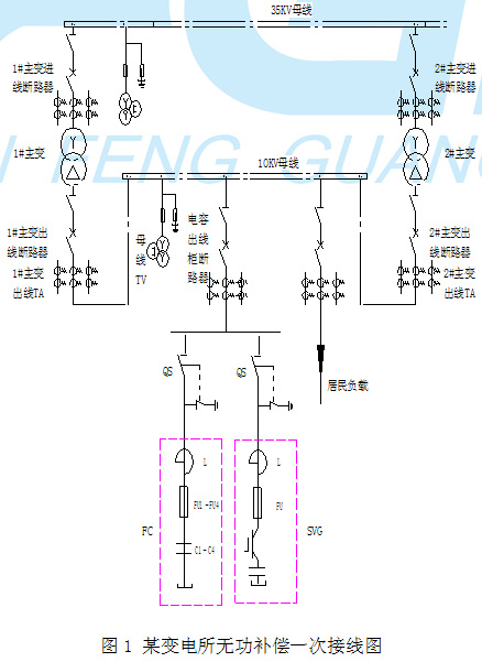 某變電所無功補償裝置安裝在變壓器次級10kV側(cè)進行集中補償,目的是降低35kV線路無功損耗和控制10kV電網(wǎng)電壓和功率因數(shù)。方案中保留了原有靜補固定電容器,在固定電容器容量的基礎(chǔ)上增加FGSVG-C2.0/10動態(tài)無功補償。這種方案性價比高,即實現(xiàn)了滿足用戶需求,達到了降低35kV線路無功損耗和控制10kV電網(wǎng)電壓和功率因數(shù)的目的,又降低了對無功補償設(shè)備的投入成本。