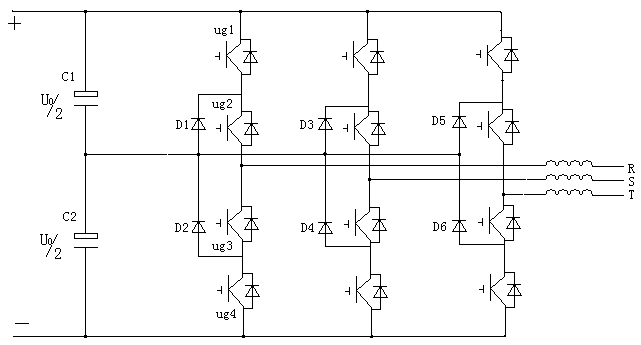當(dāng)裝置功率大時(shí),需要這樣幾個(gè)主電路并聯(lián),并聯(lián)時(shí)需考慮均流與環(huán)流及其相位問題,同時(shí)采用二極管鉗位的三電平電路需考慮直流端電容中點(diǎn)電位不平衡問題,在軟件PWM波生成電路中尤其注重此點(diǎn)。