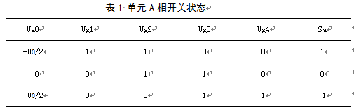 以A相為例:Ug1和Ug2導(dǎo)通時(shí),A相輸出+U0/2;Ug2和Ug3導(dǎo)通時(shí),A相輸出零電平;Ug3和Ug4導(dǎo)通時(shí),A相輸出-U0/2。如果用Sa、Sb、Sc分別表示各橋臂的開關(guān)狀態(tài),每一橋臂都有三種開關(guān)狀態(tài),如表1所列。