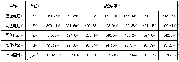 我公司做的大功率可再生能源回饋并網(wǎng)裝置經(jīng)鐵道部產(chǎn)品質(zhì)量監(jiān)督檢驗(yàn)中心檢驗(yàn)證明:具有輸出功率大、網(wǎng)側(cè)電流波形好、整體效率高等特點(diǎn)。表2是功率因數(shù)、直流側(cè)輸入電壓、網(wǎng)側(cè)交流電流及整體效率的簡表。